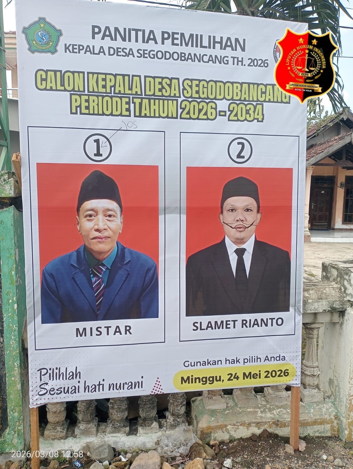 Menurut informasi yang dihimpun dari masyarakat setempat, panitia Pilkades Segodobancang periode 2026–2034 dinilai kurang transparan dalam menyikapi sejumlah persoalan yang terjadi di lapangan. Salah satu yang menjadi sorotan adalah adanya tindakan pencoretan gambar atau alat peraga milik calon Slamet Rianto di beberapa titik wilayah desa.